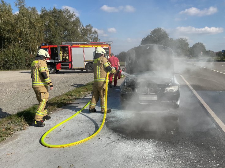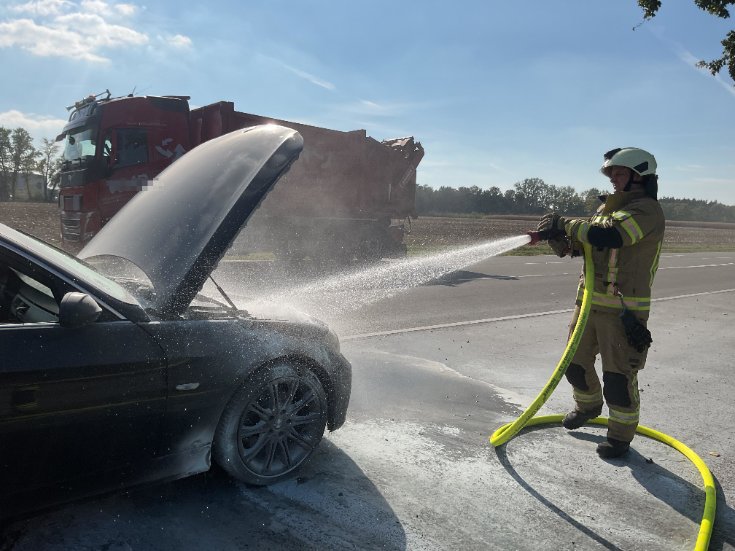 Einen herzlichen Dank spricht die Feuerwehr Garrel zwei Feuerwehrmännern einer auswärtigen Feuerwehr aus. Die beiden Kameraden waren am Mittwochnachmittag auf einen brennenden Pkw auf der Beverbrucher Straße zugekommen. Sie konnten mit zwei Feuerlöscher den Brand im Motorraum löschen und ein Ausbreiten der Flammen auf das komplette Fahrzeug verhindern. So brauchte die Feuerwehr Garrel, die um 14:29 Uhr mit dem Stichwort „Feuer 1 – Pkw Brand“ alarmiert wurde, nur noch kurz den Motorraum mit Wasser weiter herunterkühlen. Anschließend klemmten die Einsatzkräfte noch die Batterie ab, übergaben die Einsatzstelle der Polizei und traten nach etwas über fünfzehn Minuten die Rückfahrt an.