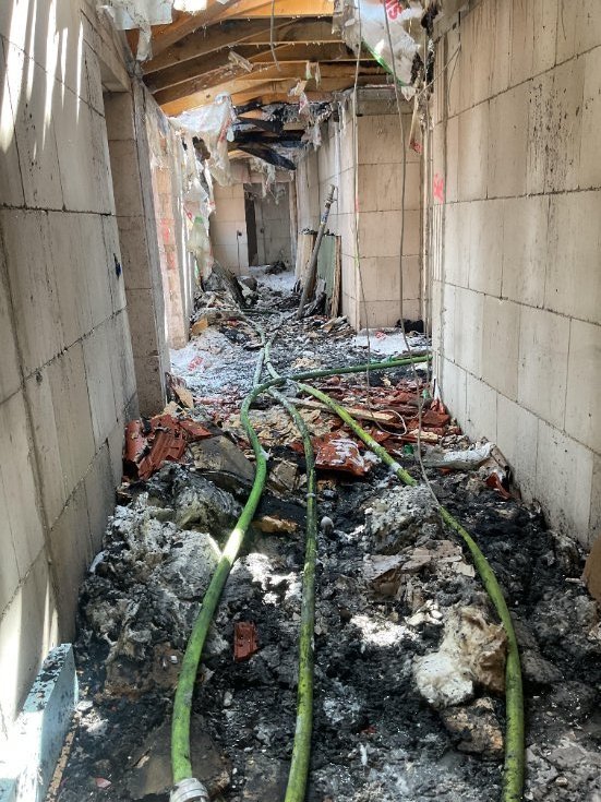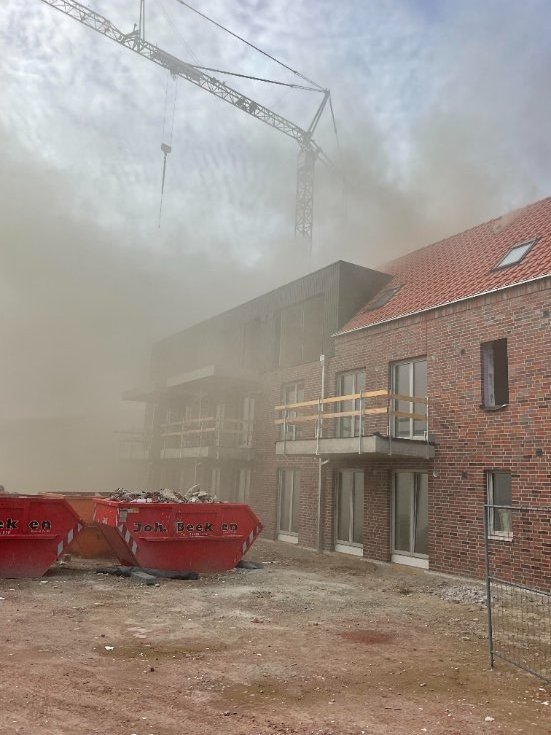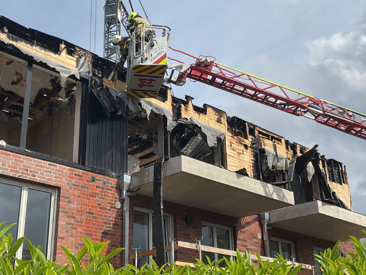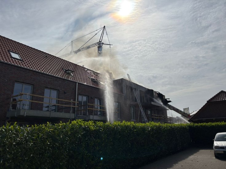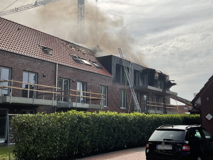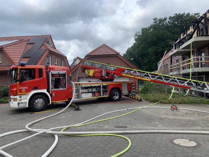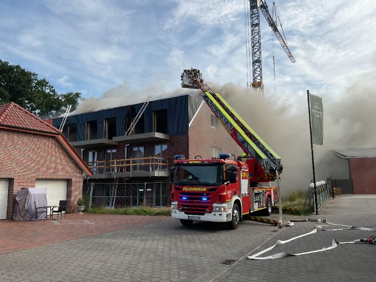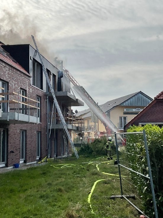 Vor Ort konnten erste Einsatzkräfte der Feuerwehr bei dem im Bau befindlichen Seniorenheim ein Feuer an der Fassade im zweiten Obergeschoss bestätigen. Sie forderten daraufhin sofort die Feuerwehr Cloppenburg mit ihrer Drehleiter an und begannen mit dem Innen- und Außenangriff. Angesichts der rasanten Brandausbreitung mussten schon kurze Zeit später die beiden Feuerwehren Bösel und Friesoythe hinzugerufen werden. Mit der Feuerwehr Friesoythe rückte die zweite Drehleiter an.