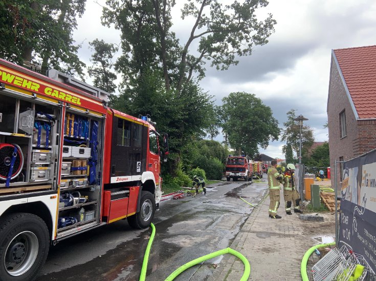 Mit so einem kräftezehrenden und personalintensiven Einsatz haben die Garreler Feuerwehrmänner nicht gerechnet, als sie am Freitagmorgen um 09:01 Uhr gerufen wurden. Bei einem Neubau am Prozessionsweg sollte es zu einem Fassadenbrand gekommen sein, so die weitere Information bei der Alarmierung.